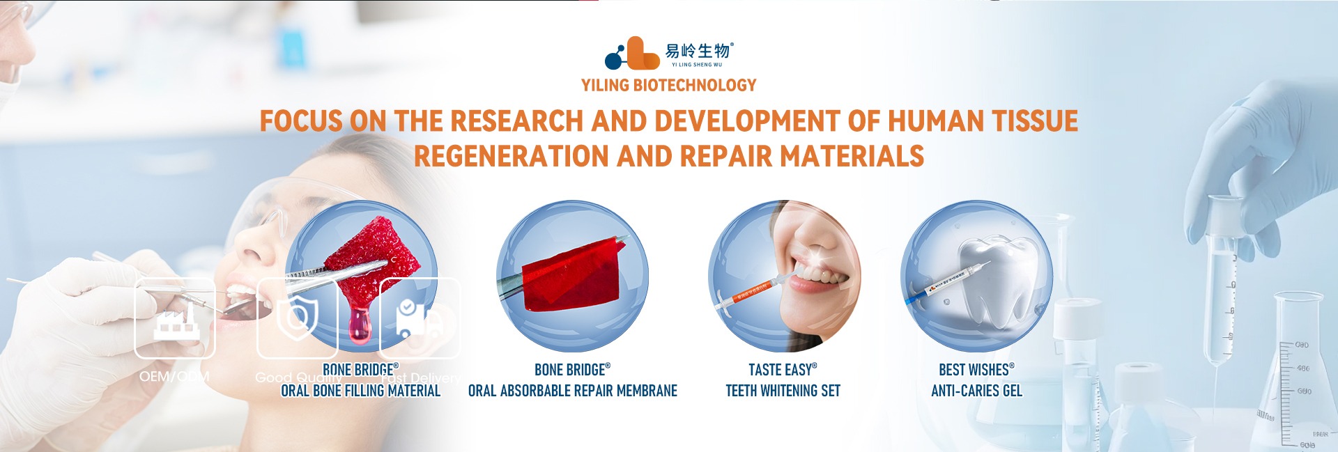 After seven years of research and development, we have launched products such as oral bone graft material (exclusively containing growth factors), absorbable repair membranes, tooth bleaching agents, desensitizers, anti-caries gels, and bacteriostatic gels